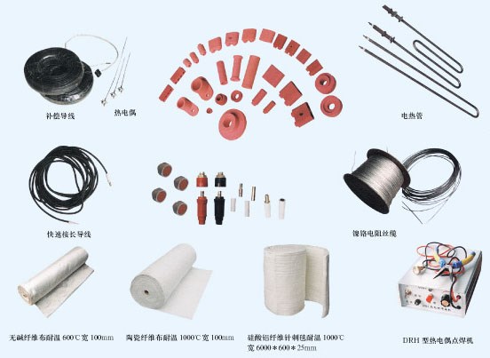 分度热电偶、补偿导线、接插件、成缆电热丝、磁钢、硅酸铝纤维针刺毯、纤维布、金属管状电热元件等。